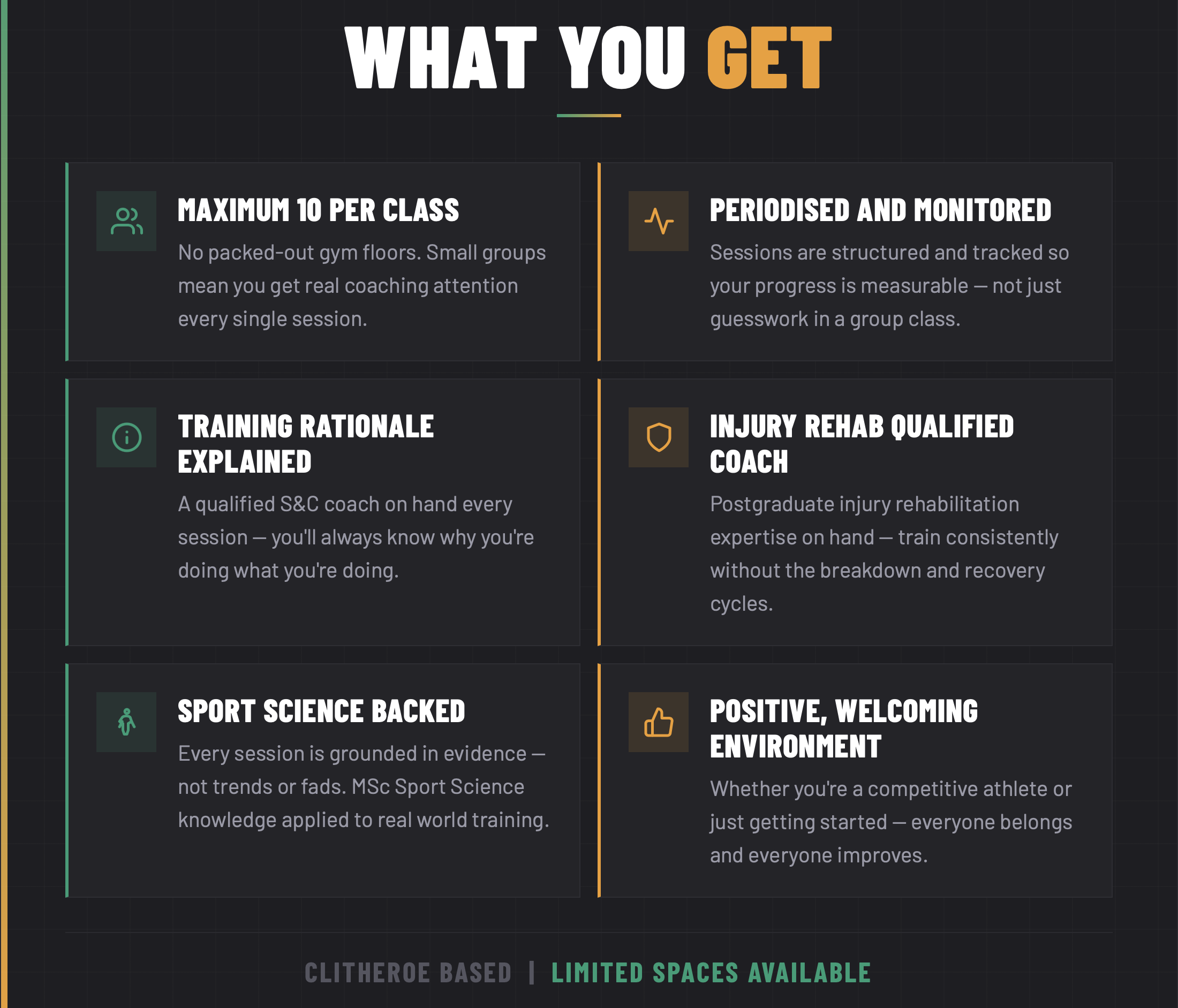 Fill in this 60 second form so I can get more of an idea of your aspirations. And also what sport you are involved in (not essential) and any potential problems that you need addressing from these classes.